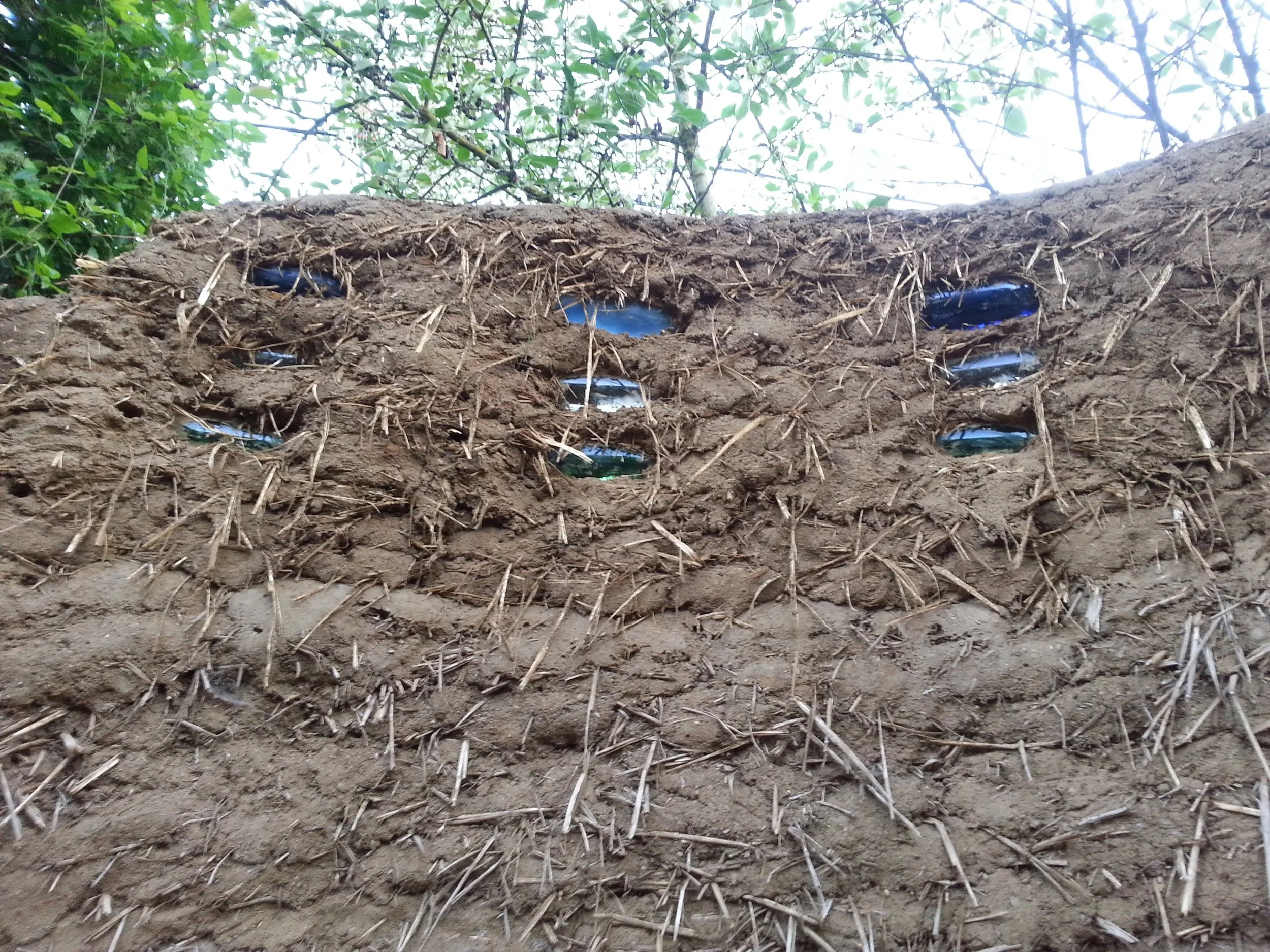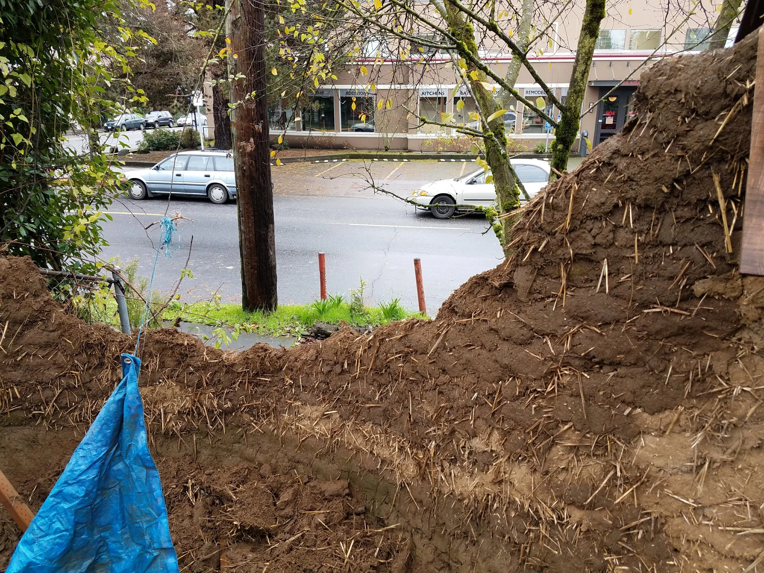 The not yet roofed part of cob wall collapsed this morning after an extended rain storm. Per the warnings in all the cob building books, it had saturated with rain and collapsed. I had initially tried to cover it with a tarp a week or two ago when the rain started in earnest, but the tarp kept blowing off in the wind. I had intended to build a shelter over the top of this part of the wall instead of putting a roof on it like the rest of the wall, but other priorities had continually got in the way. I had spent many days building that part of the wall and putting in green, blue and clear glass bottles to make stain-glass Cascadia flags, and when it had finally come together I was very proud.
